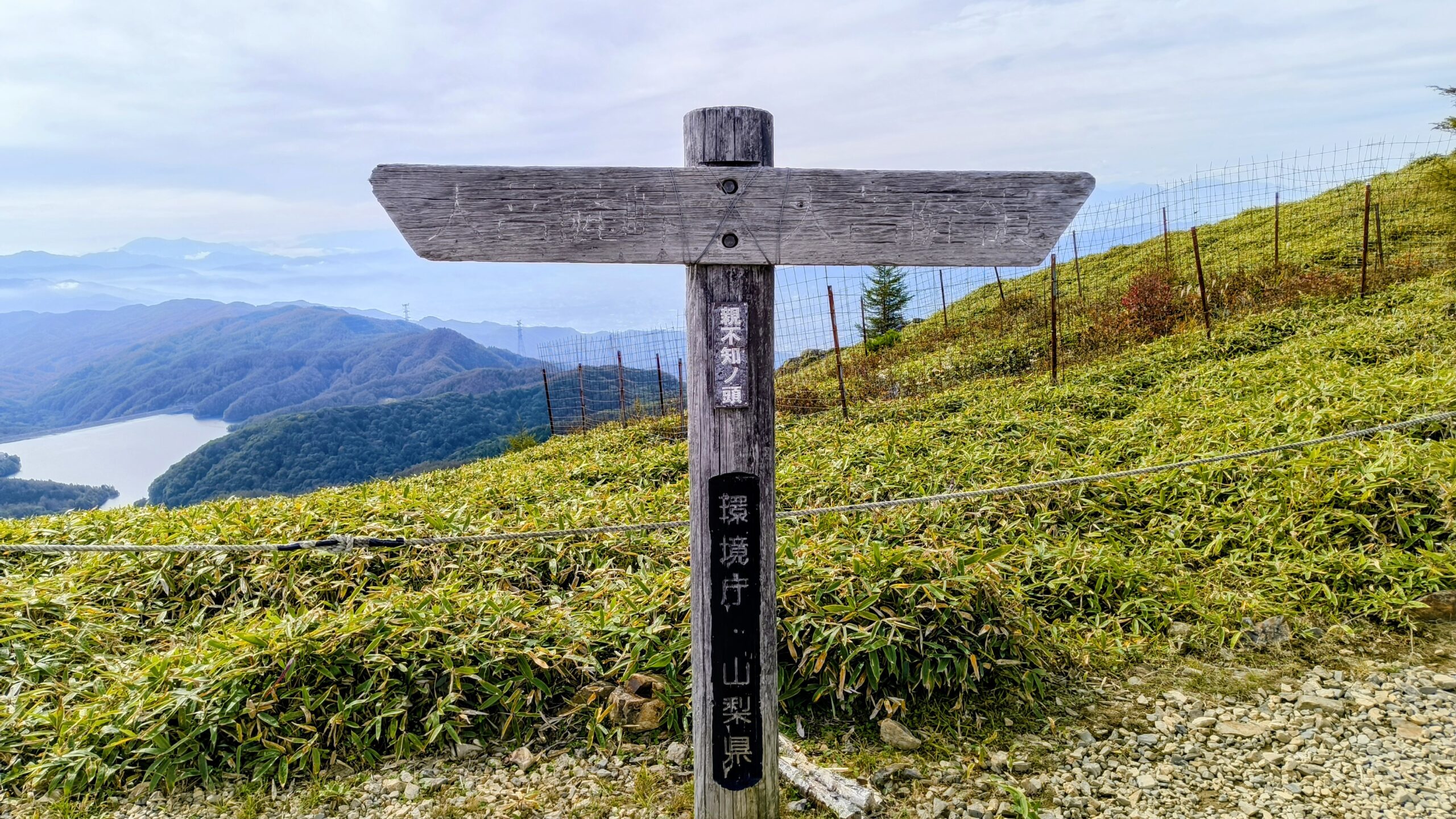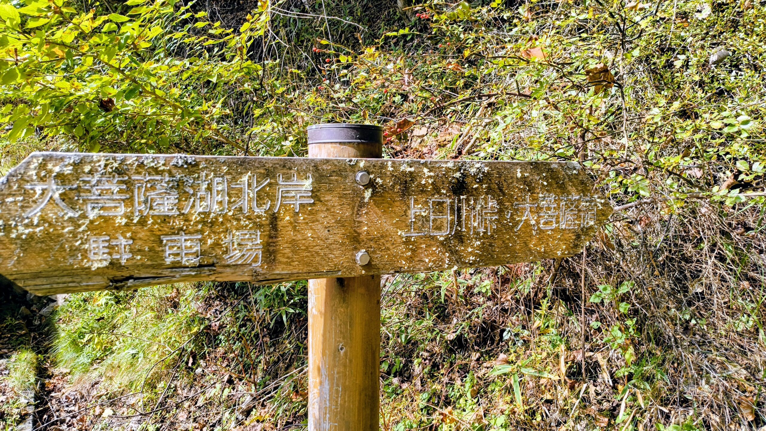 「上日川ダム北岸」と「自然観察歩道」の看板を通り、歩みを進めます。「上日川ダム」って初めて聞いたなと思ったんですが、調べてみると「上日川ダム」は、1999年に完成した高さ87mのロックフィルダムだそうです。そもそもロックフィルダムとは、石や土砂を積み上げて建設する型式のダムです。標高1,486m地点に建設された、日本で3番目に高い場所にあるダムです。この人造湖は、大菩薩嶺にちなみ「大菩薩湖(だいぼさつこ」と命名されています。