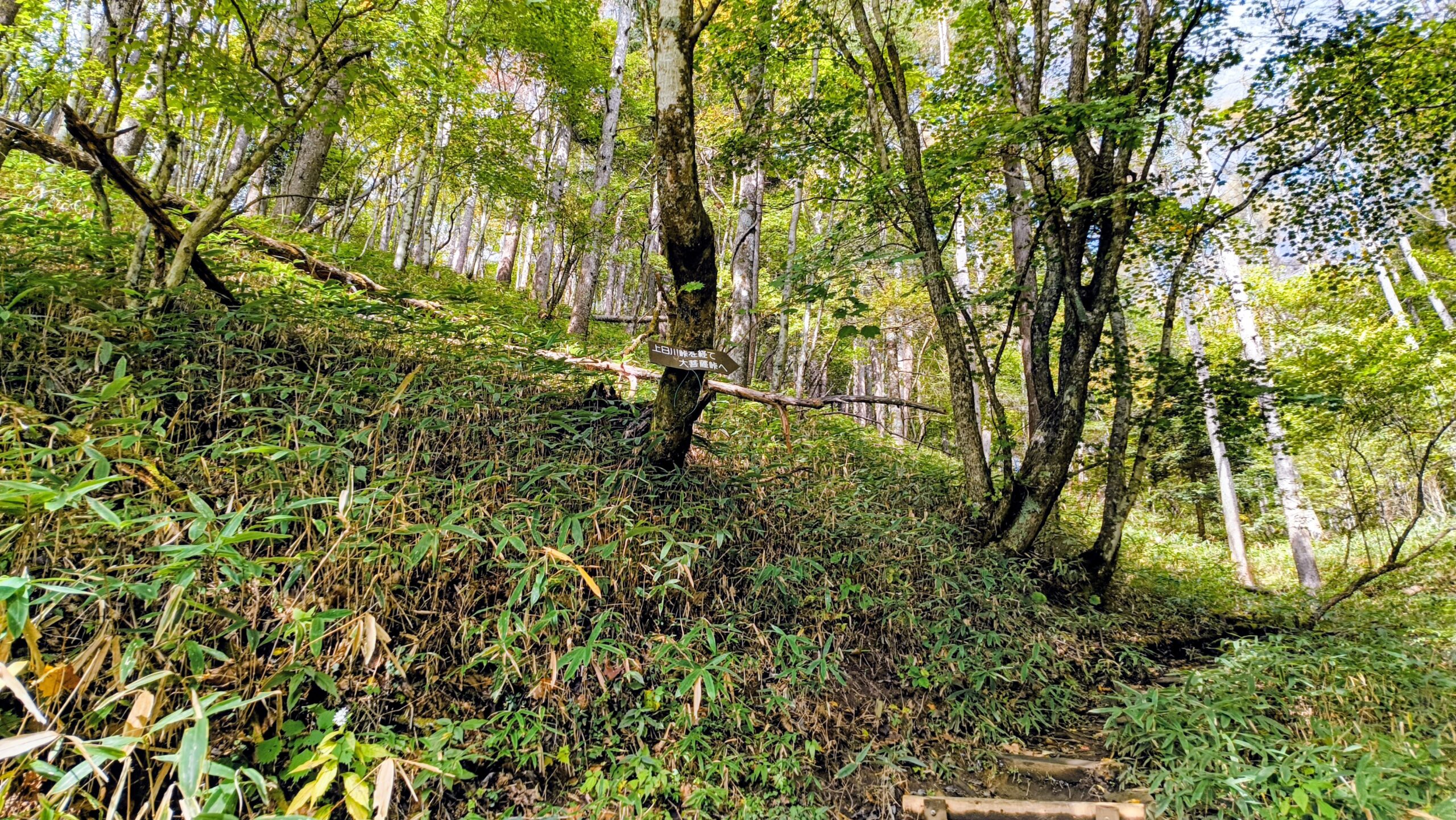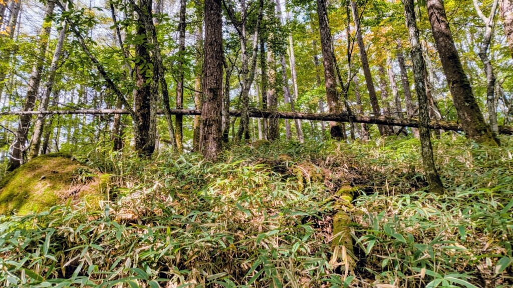 登山道の横を見れば、ササの中に倒木がありました。綺麗な倒れ方をしていて、平均台みたいに上を歩けそうですね。
