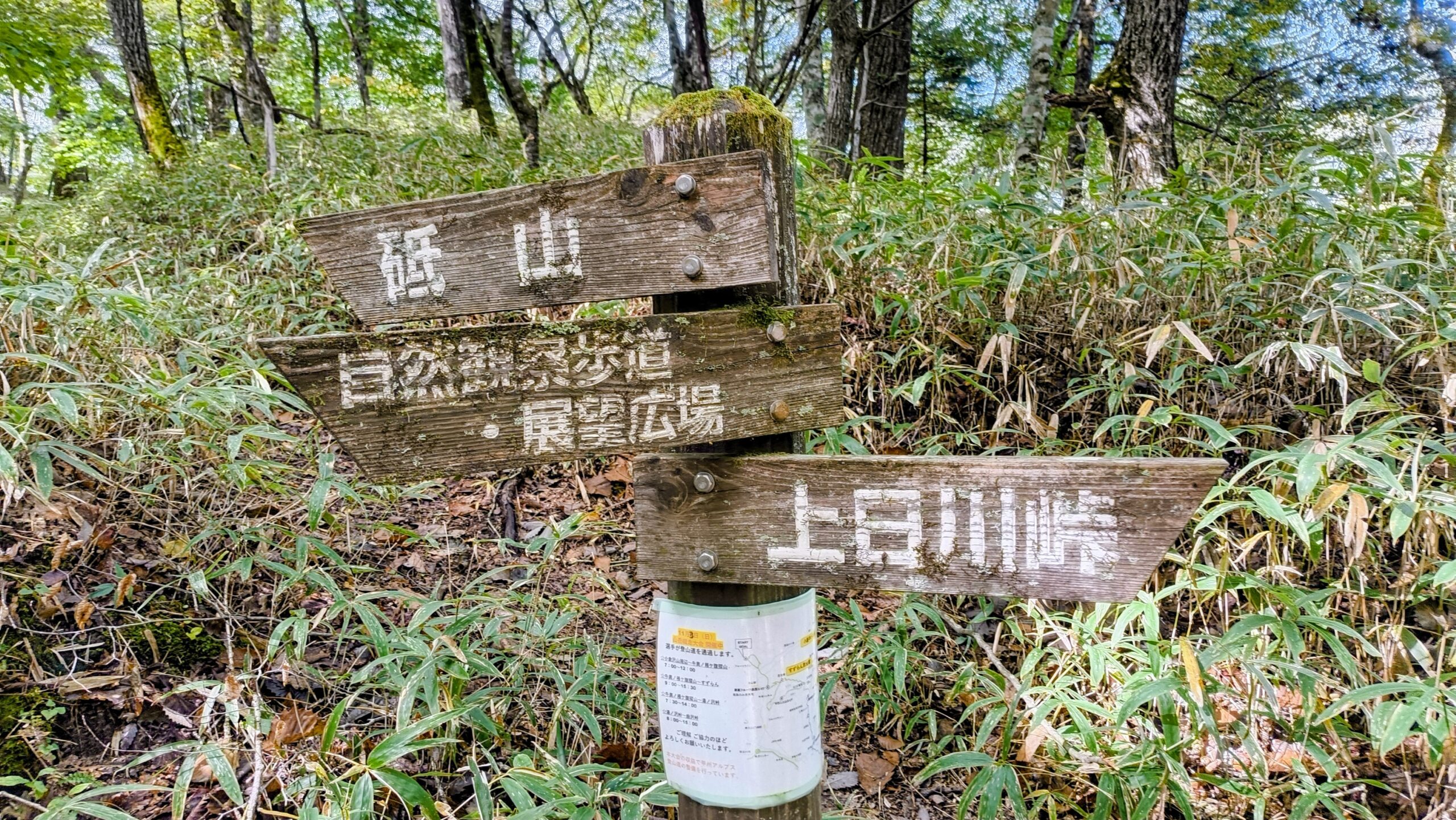 いよいよこの自然観察歩道も終わりです。この看板の下についている張り紙には、「11月3日(日)山岳縦走大会開催中」との文字が!調べてみたら、日程が1日違いでしたが、こちらの大会が出てきました。