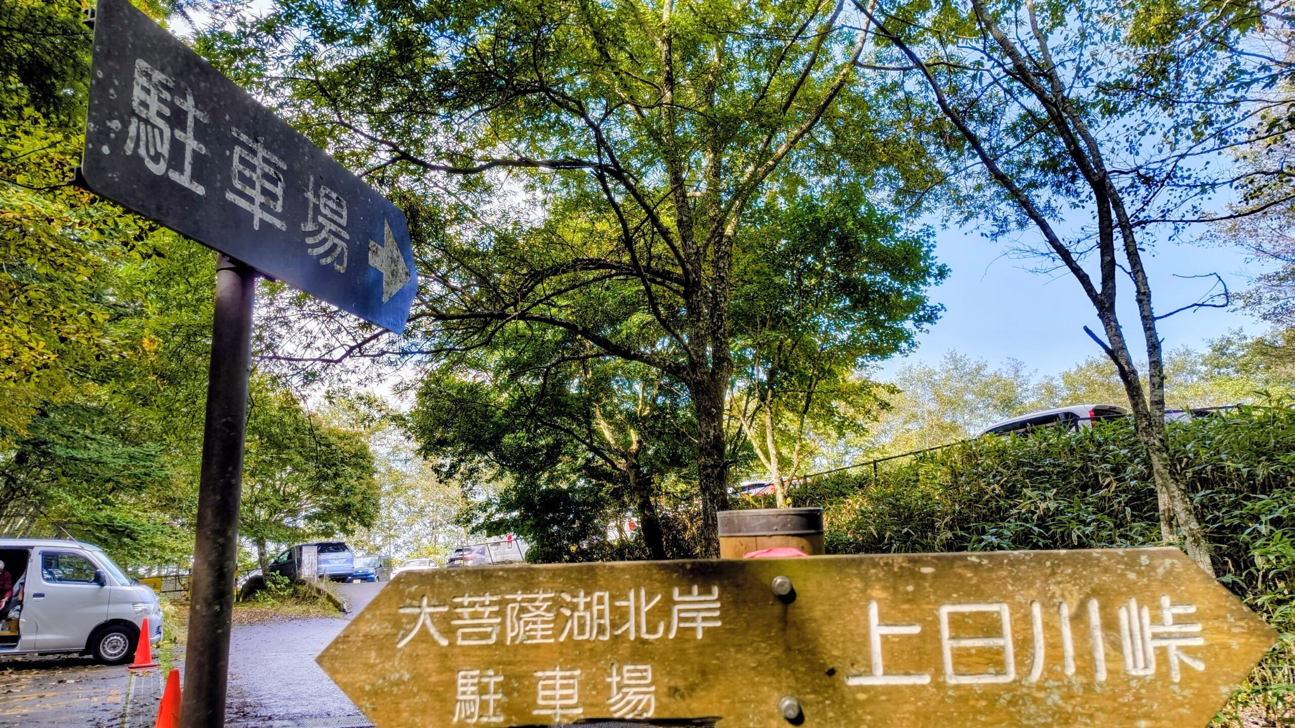 初紅葉を感じられる10月中旬、絶好のアウトドア日和です!大菩薩キャンプ場などもあり、登山以外にも色々楽しめる大菩薩嶺ですが、とにかく人気!人が多かったです。そのため大菩薩嶺の登山口付近の駐車場が滅茶苦茶に混んでました。この日の前日は、山梨県の親戚宅に前泊していたので、少しゆっくり目に出たのが裏目に出ましたね…8時30分くらいに駐車場に到着していたのですが、遅かったで…。大菩薩嶺に向かう登山口周辺には、無料駐車場が第1から第3まであり、合計120台駐車出来るとのことですが、全く駐車できず、交通整理の方に大菩薩湖周辺の第4駐車場に行ってほしいと言われ、そちらに行きます。ちなみに来た細い道を戻ります…