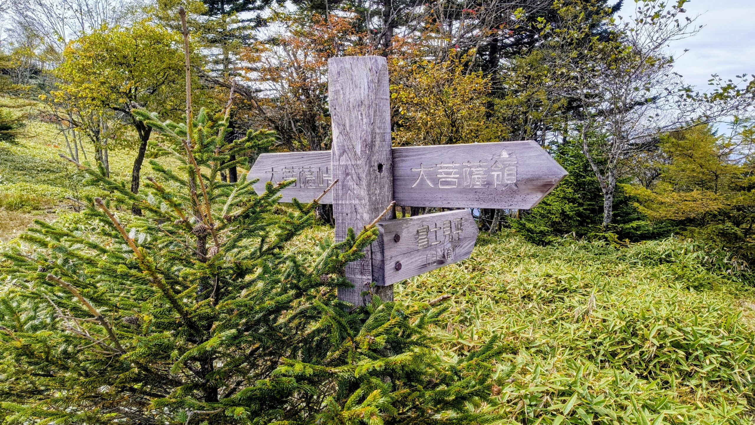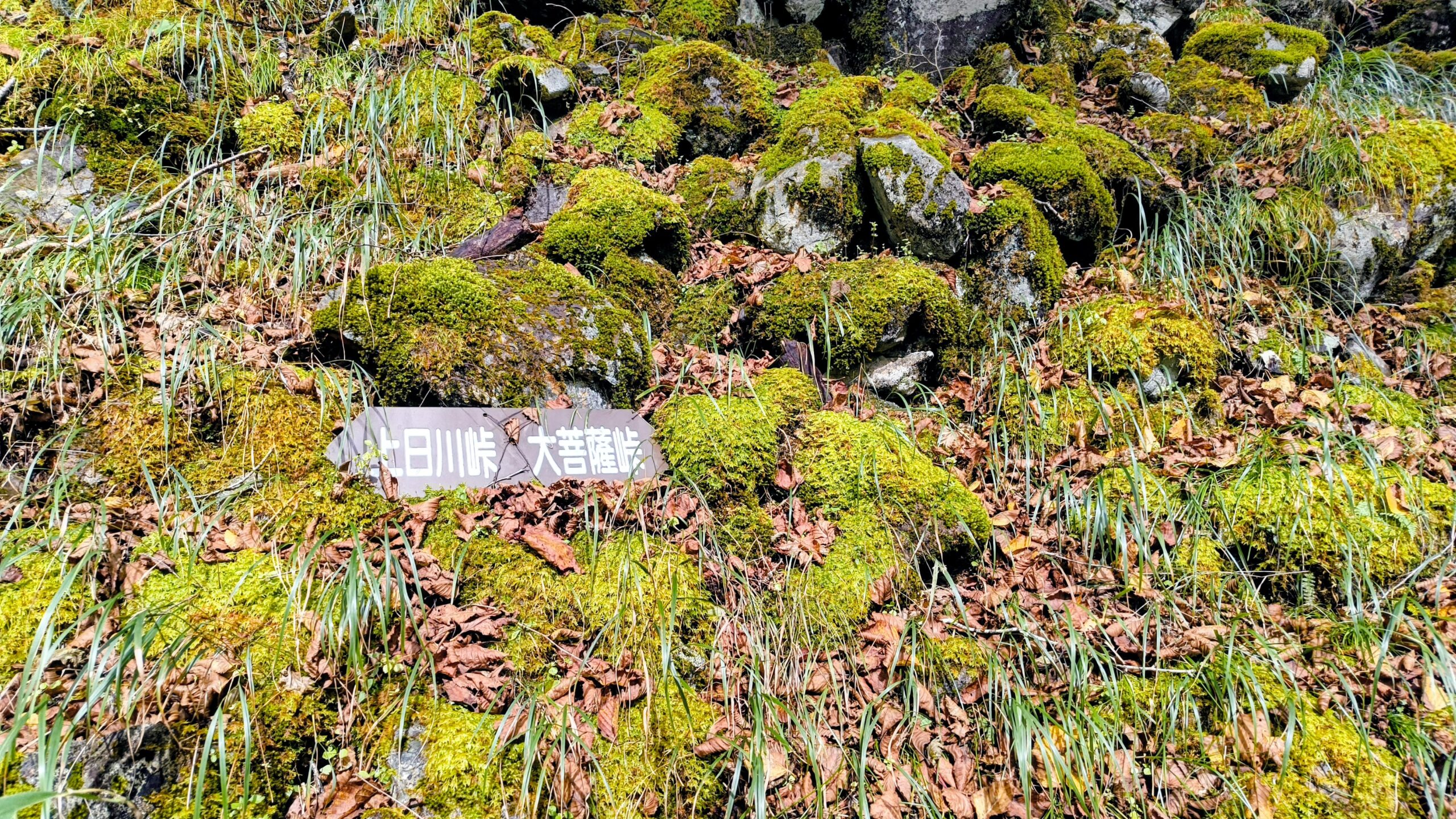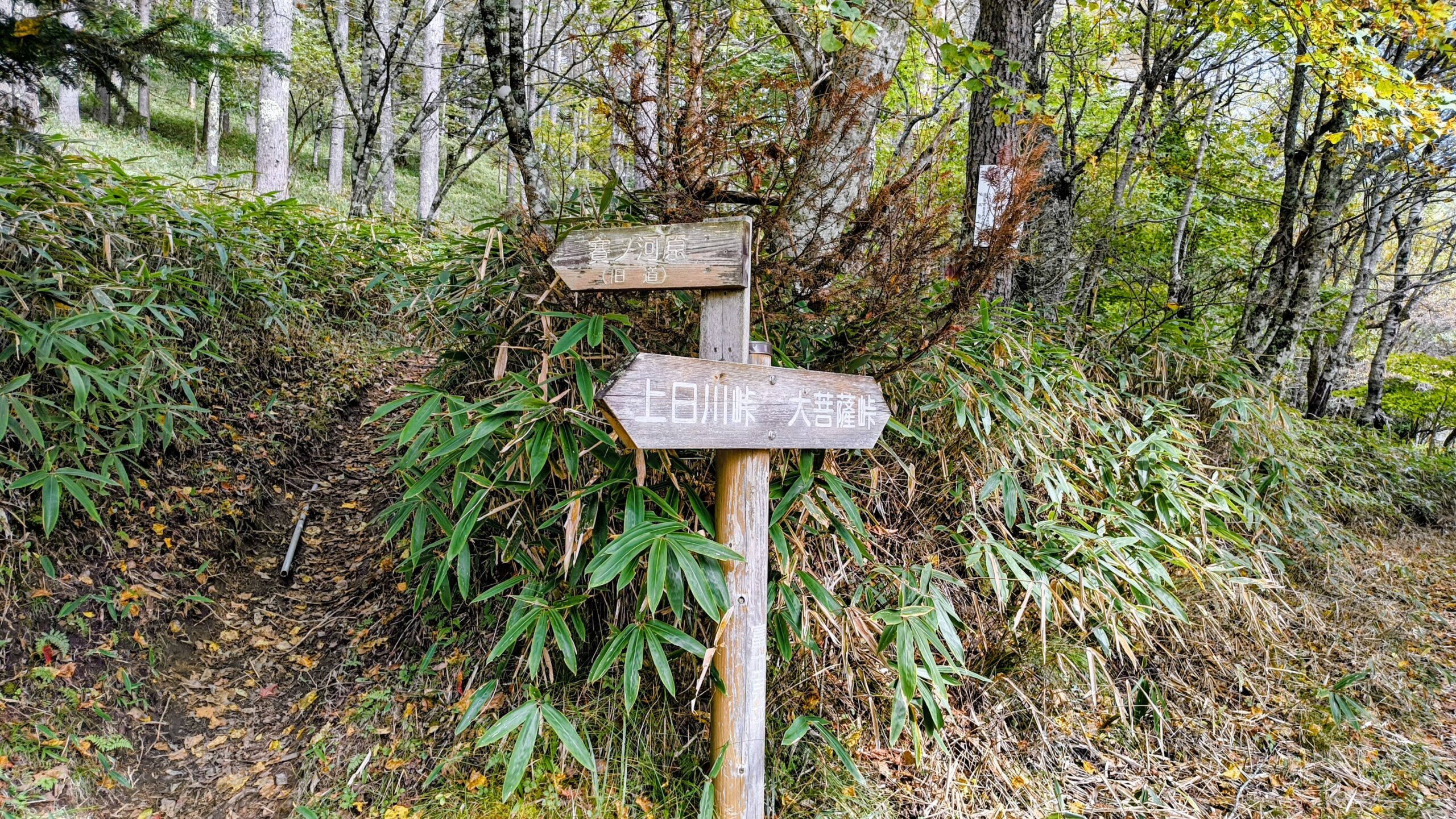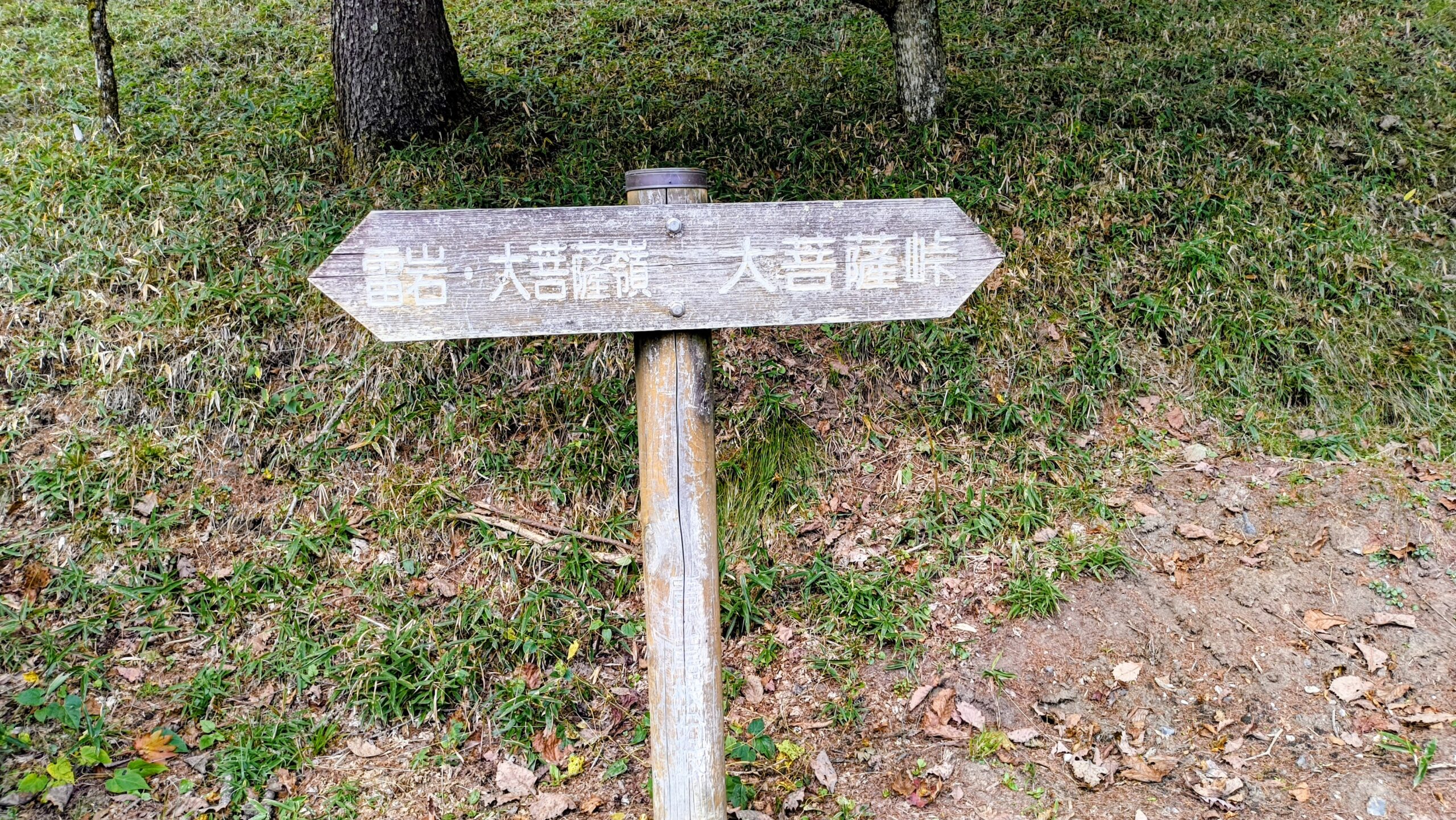 「大菩薩嶺」と「大菩薩峠」を指し示す看板です。こちらには「賽ノ河原」と書かれています。先程通過してきた「親不知ノ頭」もそうですが、子どももしくは親子関係に紐づく名前が多いですね。