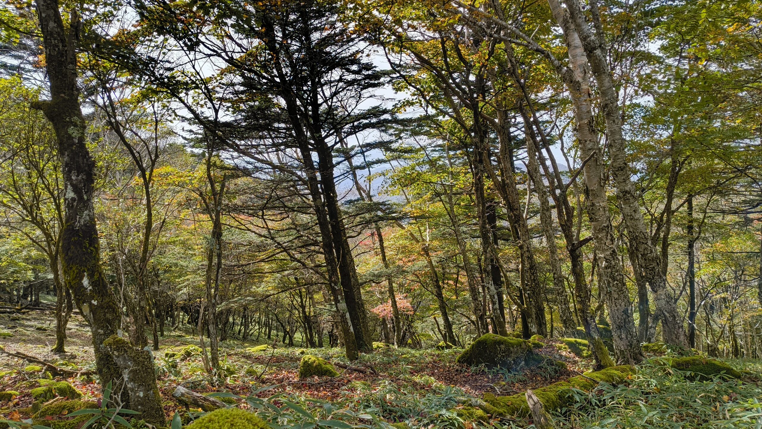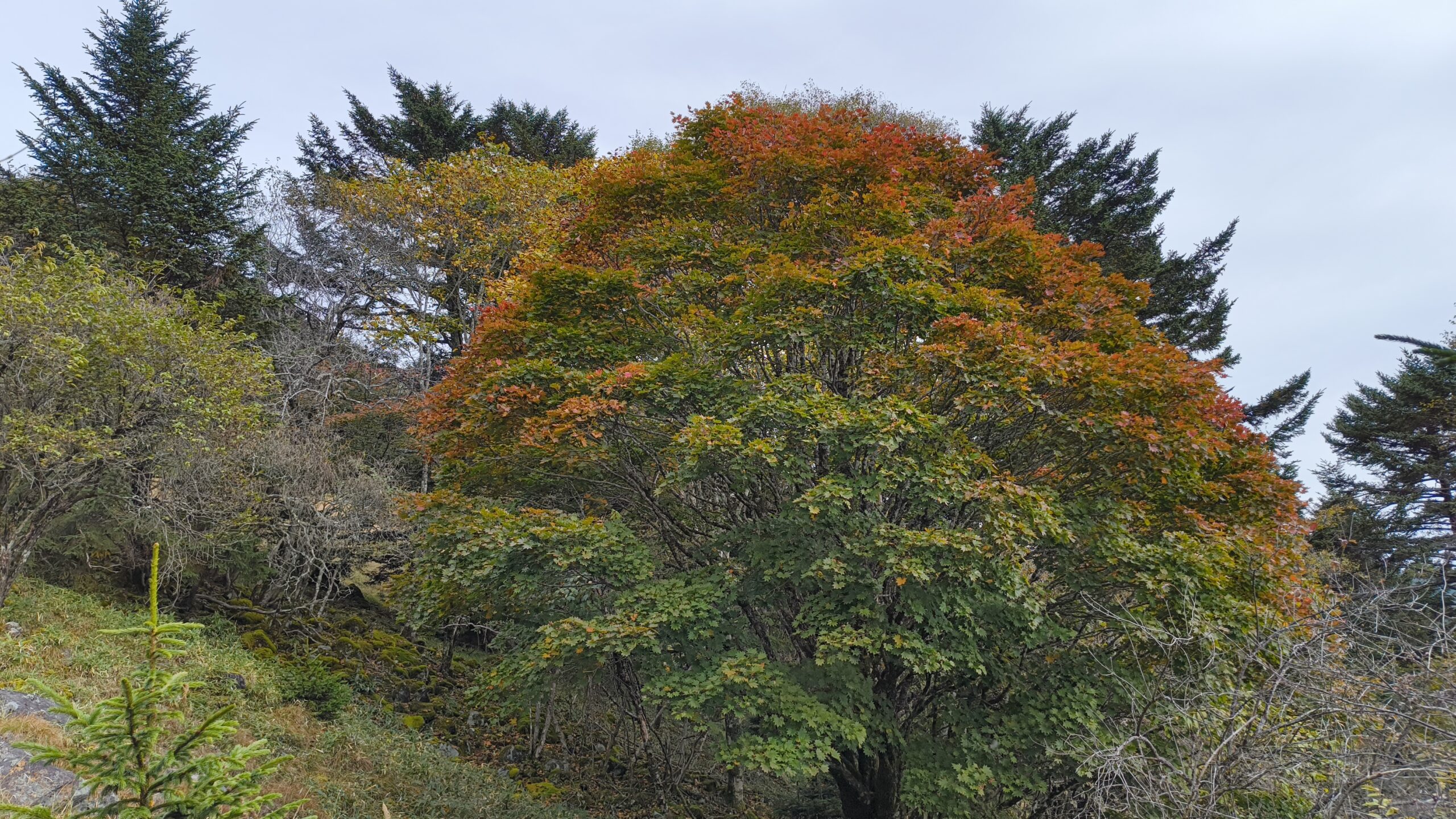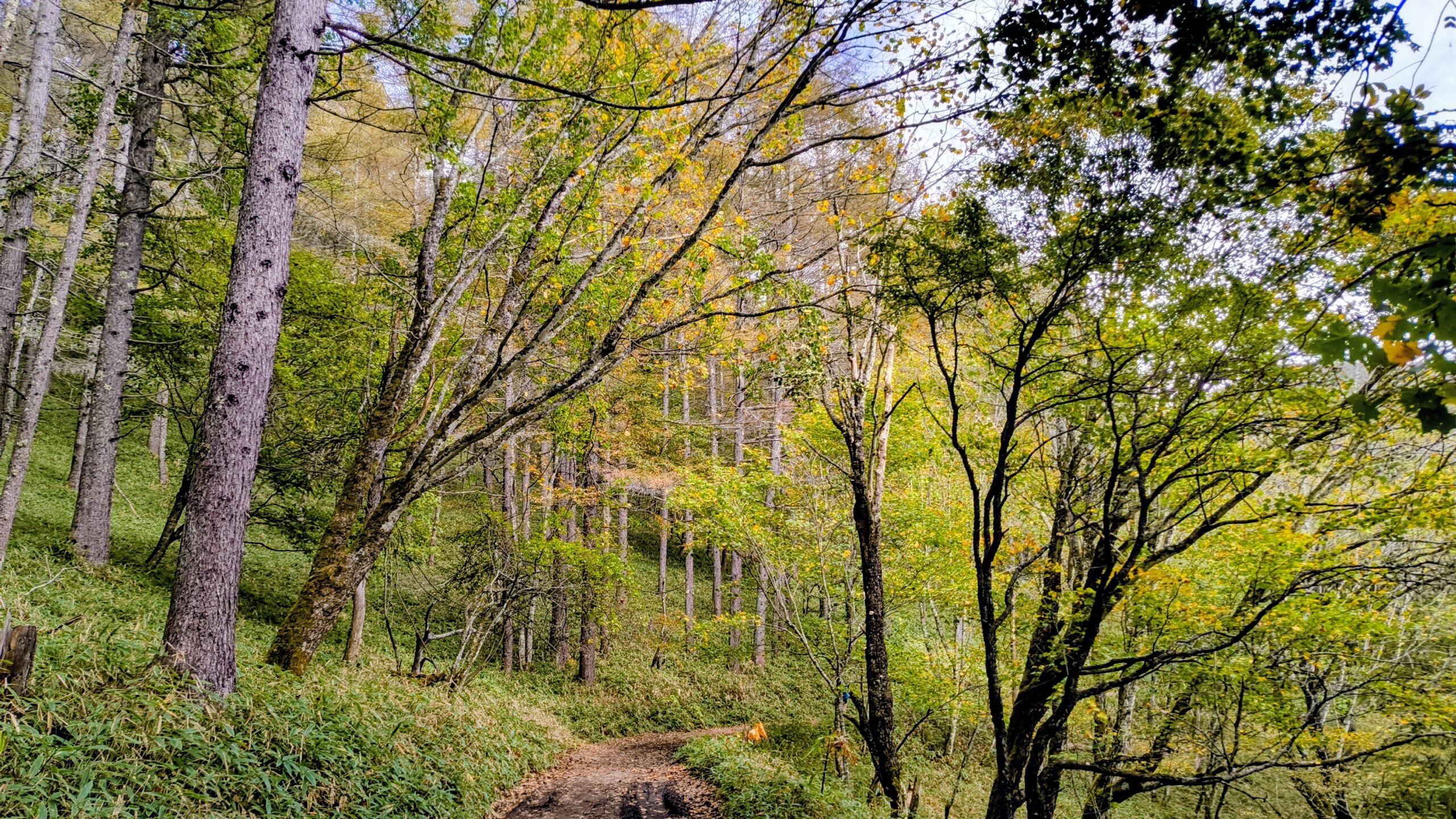 緩やかに登り坂が始まります。写真でもわかりますが、既にこの時点で紅葉が見られます。色んな色が鮮やかで最高ですね。素敵です。
