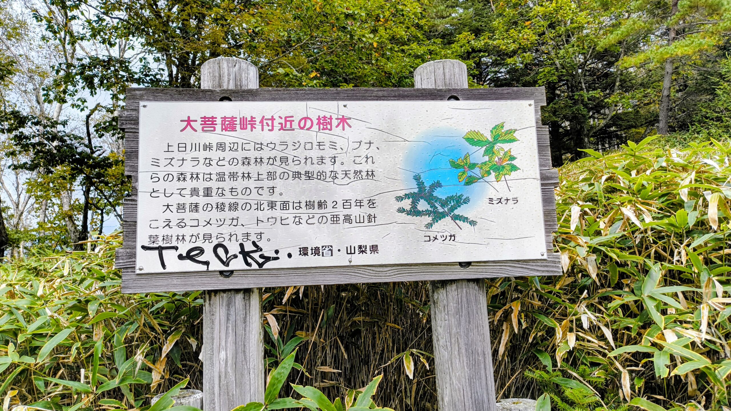 そんな登山道を作ってくれた方々や、維持管理していただいている方々に対して、感謝だなーと考えながらあるいていると、環境省と山梨県が設置してくれた看板を見つけました。上日川峠周辺は、「ウラジロモミ」や「ブナ」、「ミズナラ」が生育しており、これらの森林は温帯林上部の典型的な天然林だそうです。大菩薩嶺稜線の北東面は、樹齢200年を超える「コメツガ」や「トウヒ」などの亜高山針葉樹林が見られるそうです。