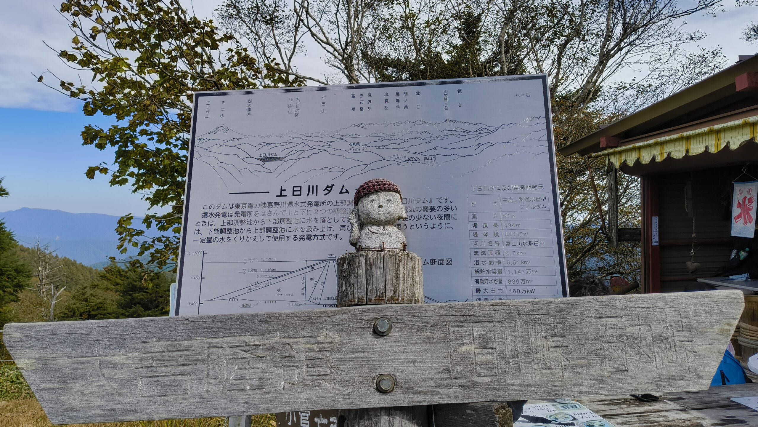 「上日川ダム(大菩薩湖)」の説明看板です。その前には「お地蔵さま」がいらっしゃいます。