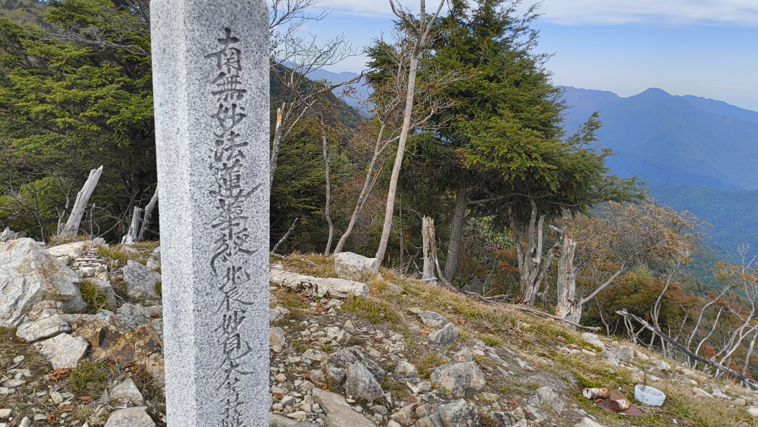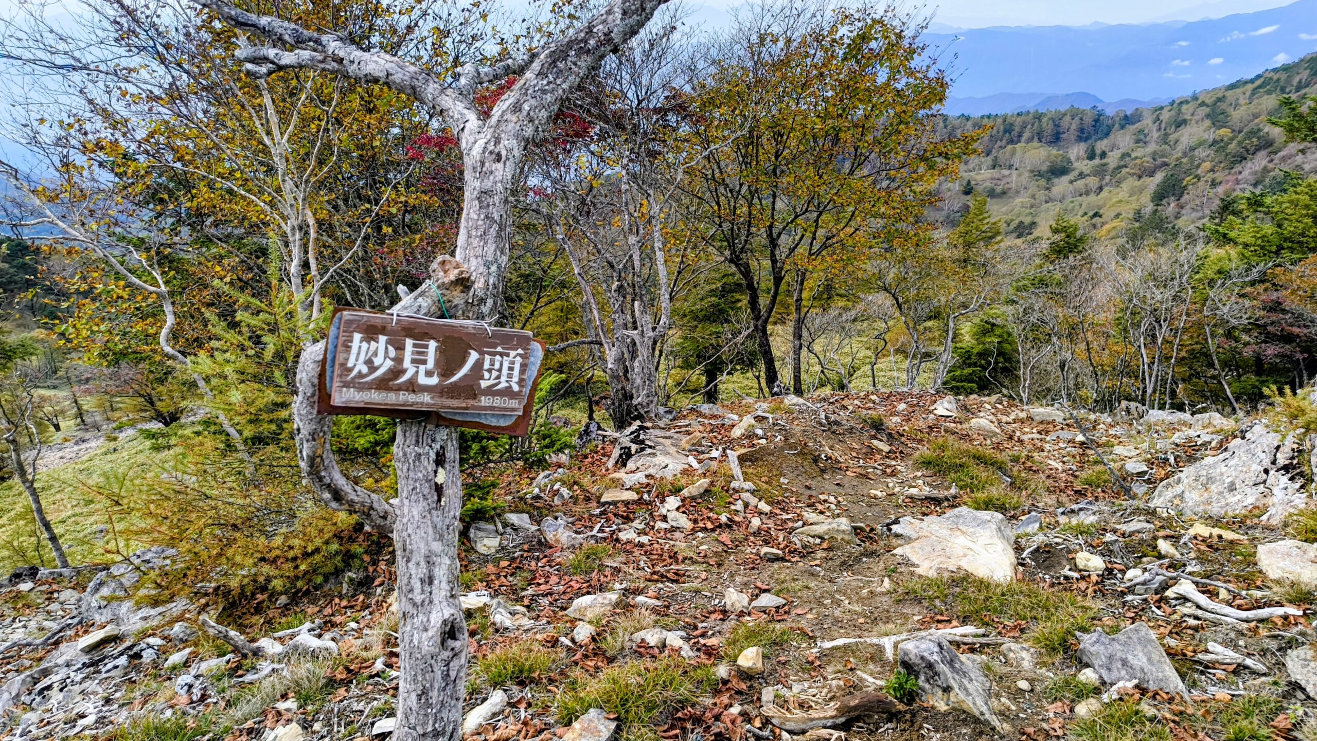さきほどの石柱のすぐ近くに、「妙見ノ頭」のピークが有りました。メインルートから外れているので、他の登山客は1組のみでした。眺望が綺麗です!