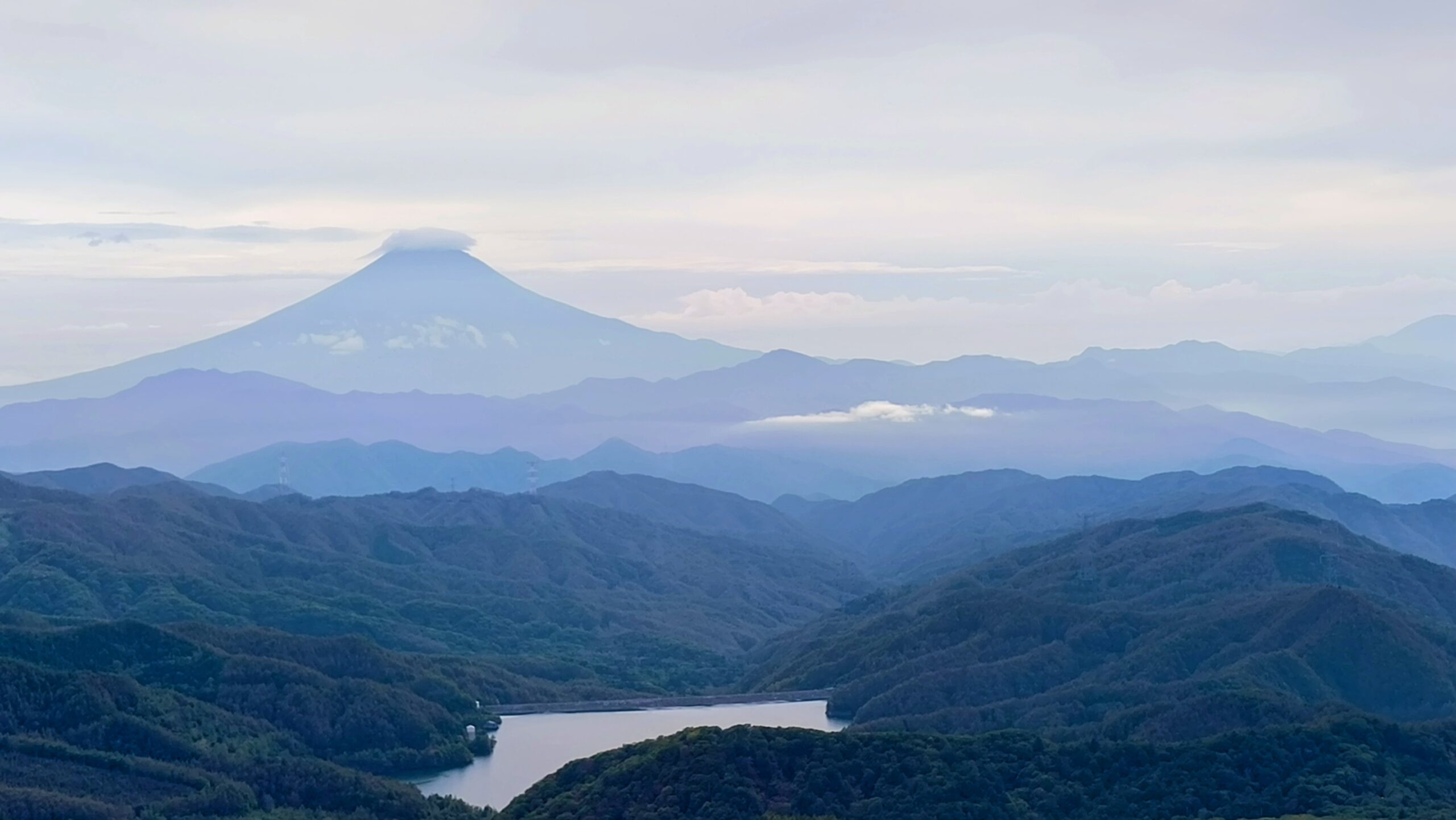ここで最後の「富士山」と「大菩薩湖」をセットで撮影!「富士山」の頂上付近に「笠雲(かさぐも)」らしきものが発生していました。独立峰の山頂に発生するそうで、発生しやすい条件はこんな感じです。